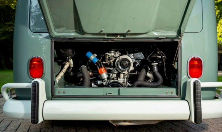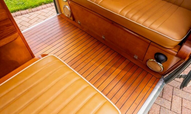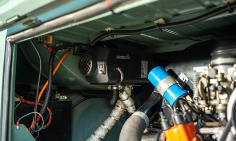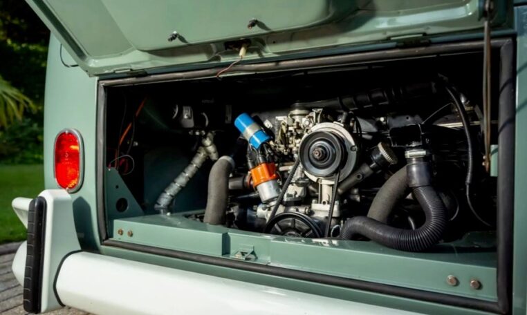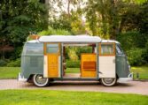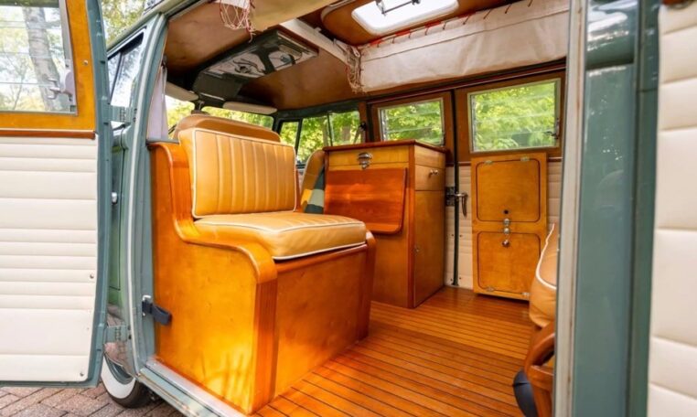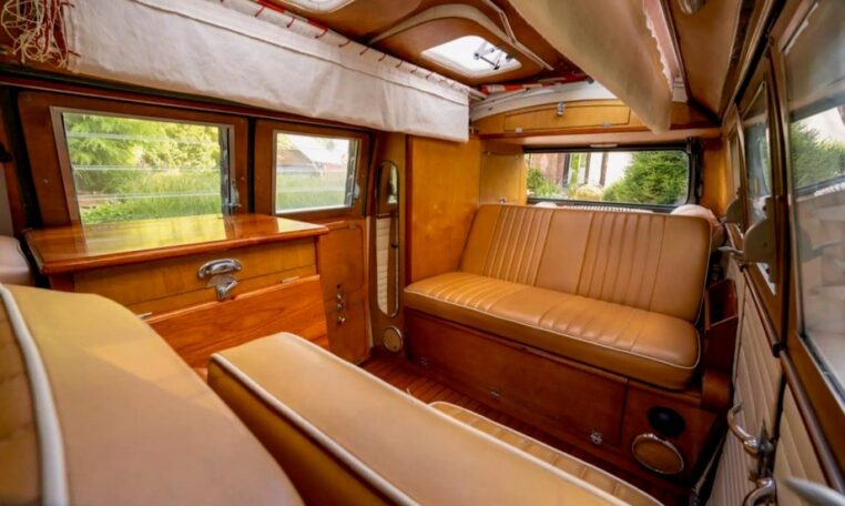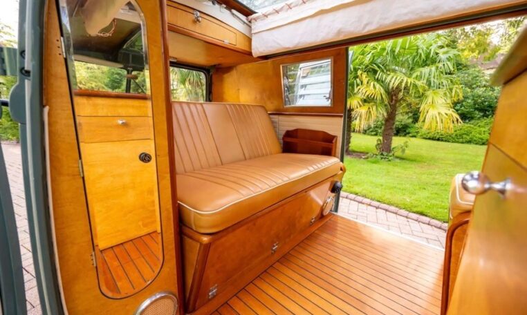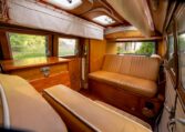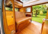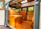 Using the original EZ Campers template, whilst retaining the original EZ pull-down bed, the whole interior has been significantly upgraded with the use of teak and marine-ply, all professionally installed and French polished. The leather seating was created by the multi-show winning Bernard Newbury Auto Interiors. It has been completely rewired and fitted with an Eberspacher heater, very effective in these vehicles, and great attention has been paid to insulation and sound deadening. With its EZ bed and double-roof bunk beds, it comfortably sleeps four people. The engine is a genuine new-old-stock 1,600cc twin-port single carb and